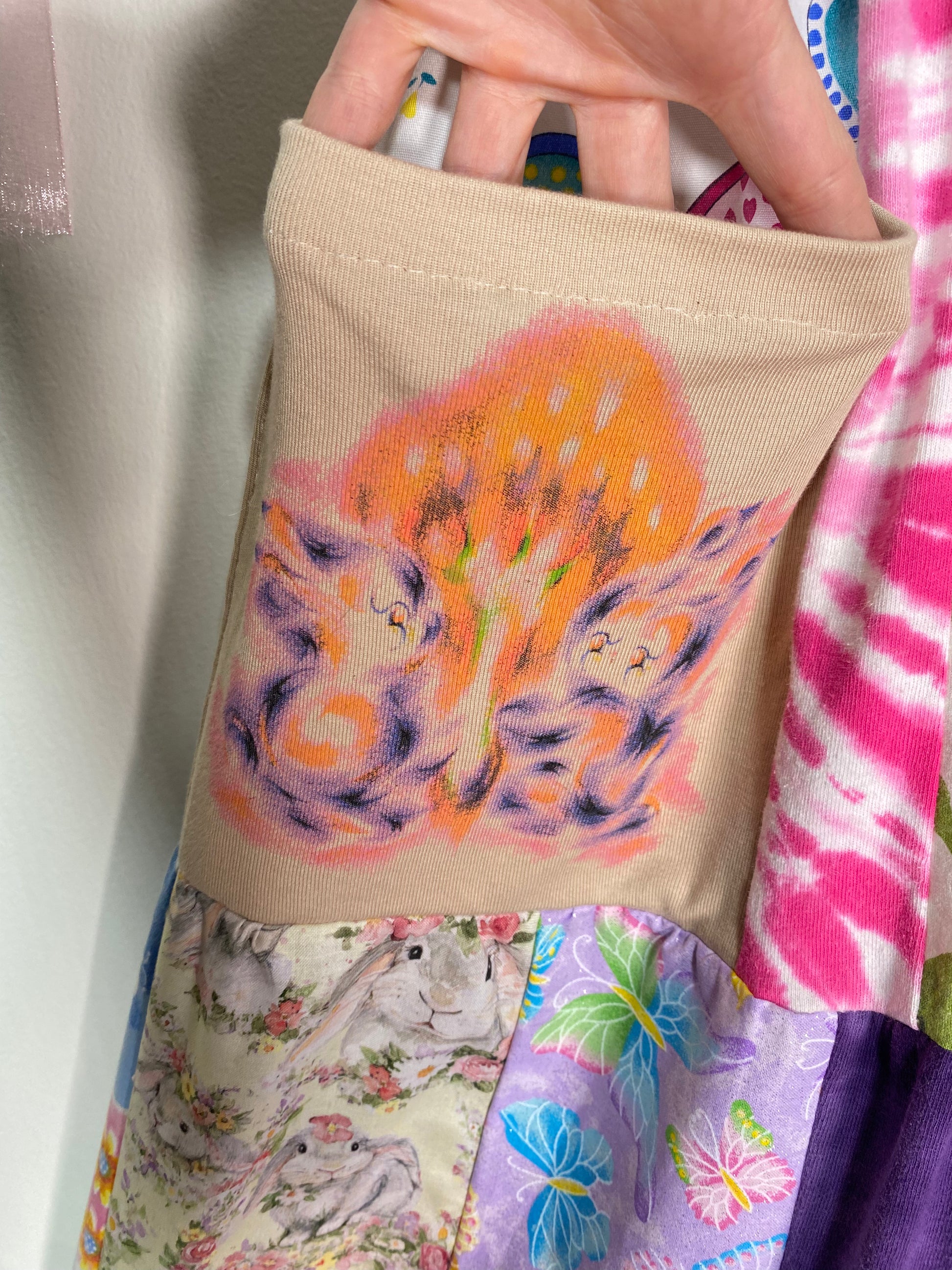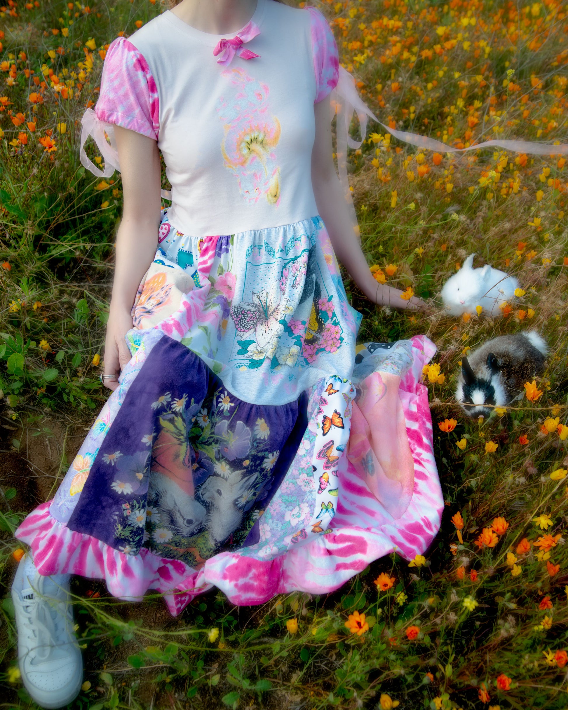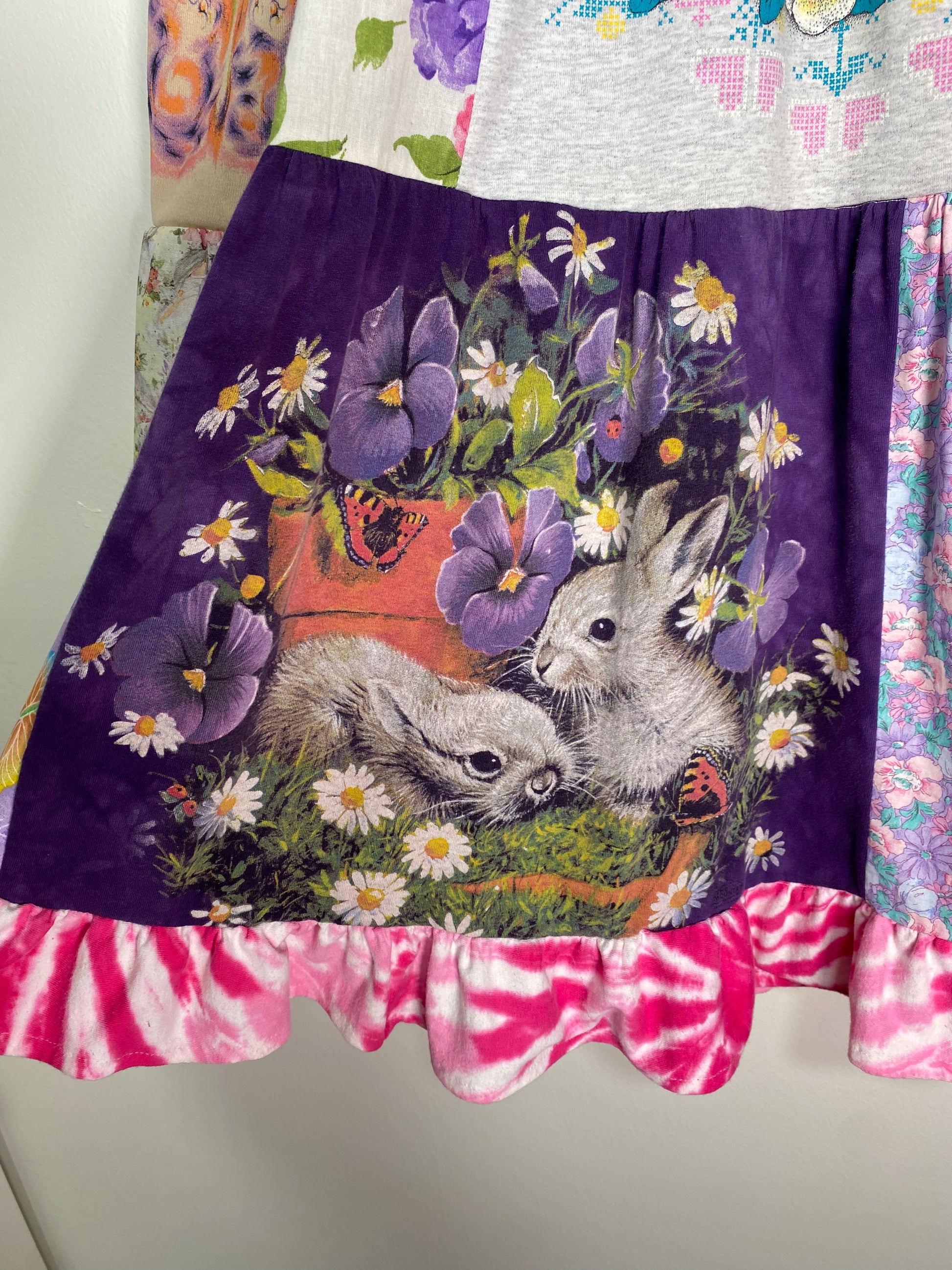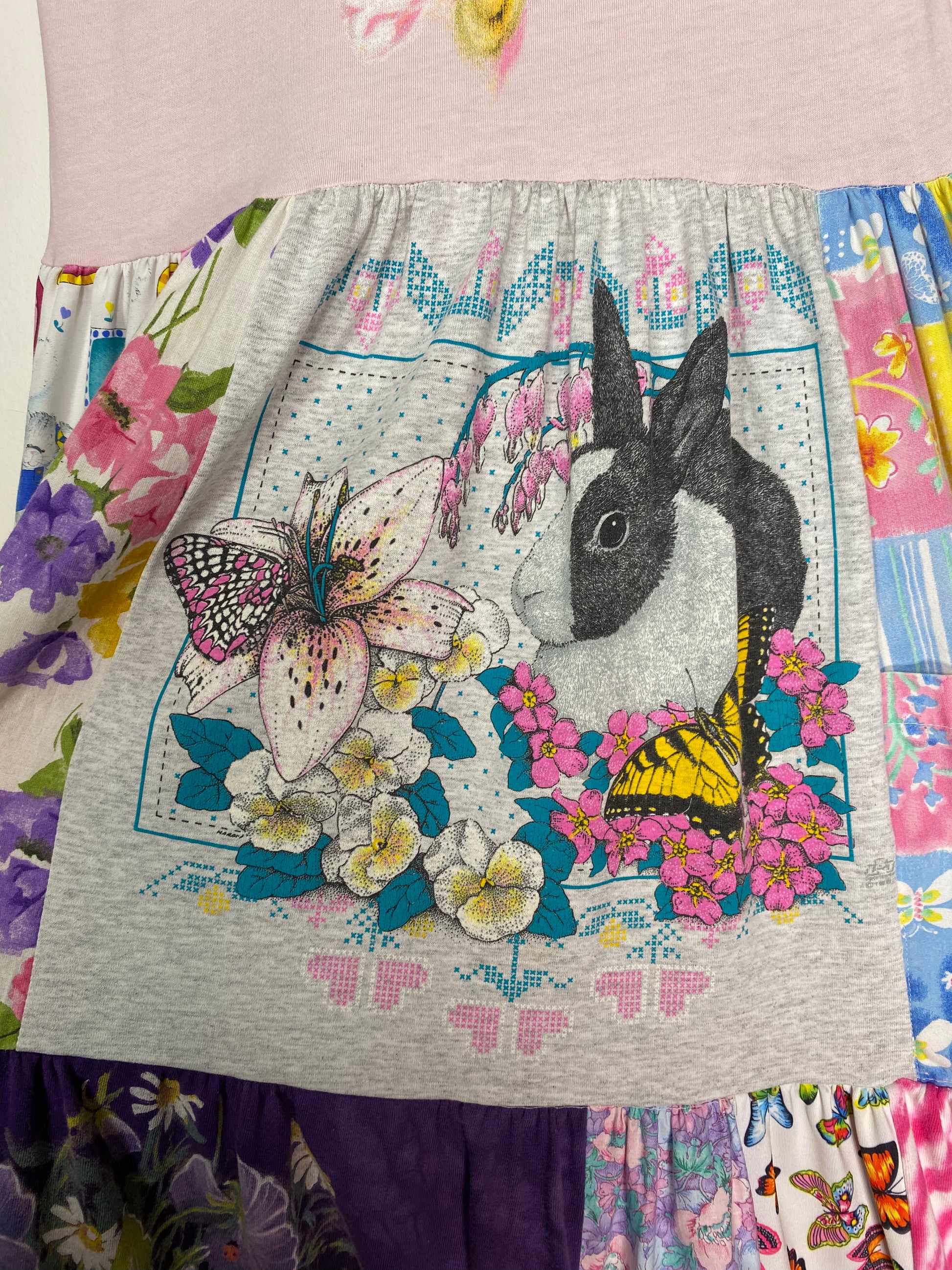 1/1 patchwork t-shirt dress made in collaboration with @unif featuring the UNIF spore bunnies tank & flame bunnies baby tee (both available @unifclothing.com) +++ vintage tees and fabrics // pls note this item is made from upcycled materials and may contain small stains, holes, snags, spots, or pilling //